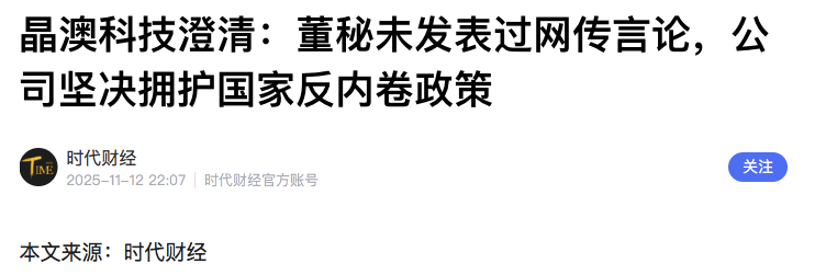 11月12日,针对网传的“反内卷”失败论,晶澳科技披露澄清公告称,公司董事会秘书未在任何内部或外部会议上发表过网传言论。相关内容系网络谣传,严重误导公众认知,损害公司及行业声誉。针对不实言论的传播行为,公司保留通过法律途径追究相关责任的权利。